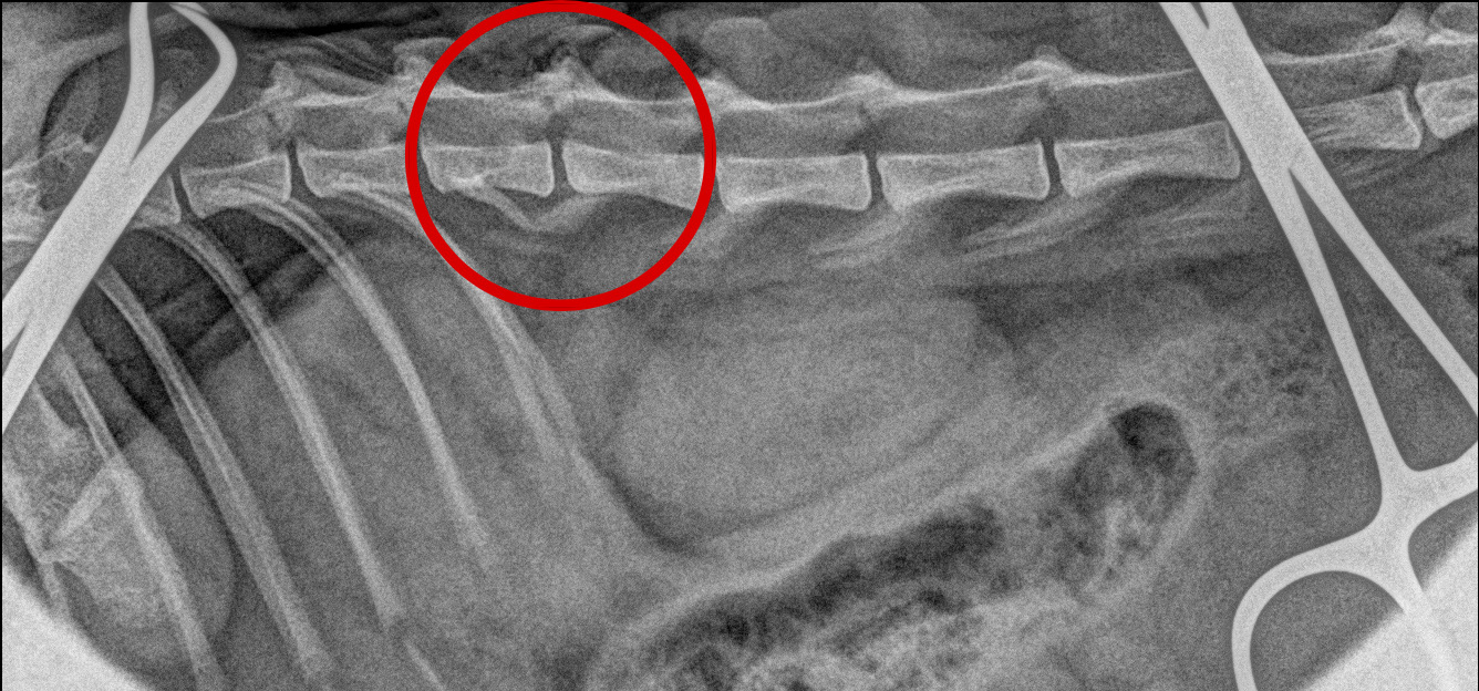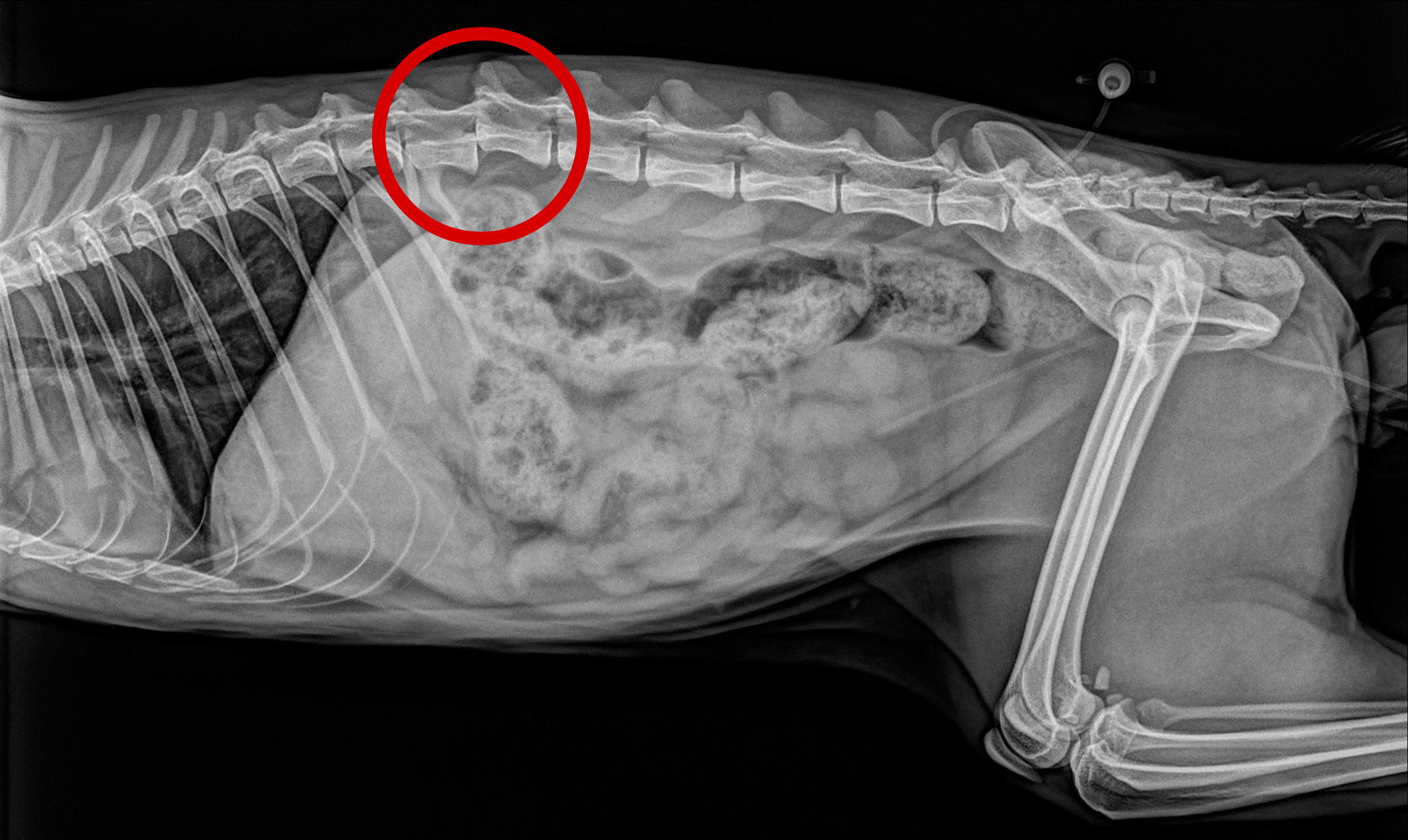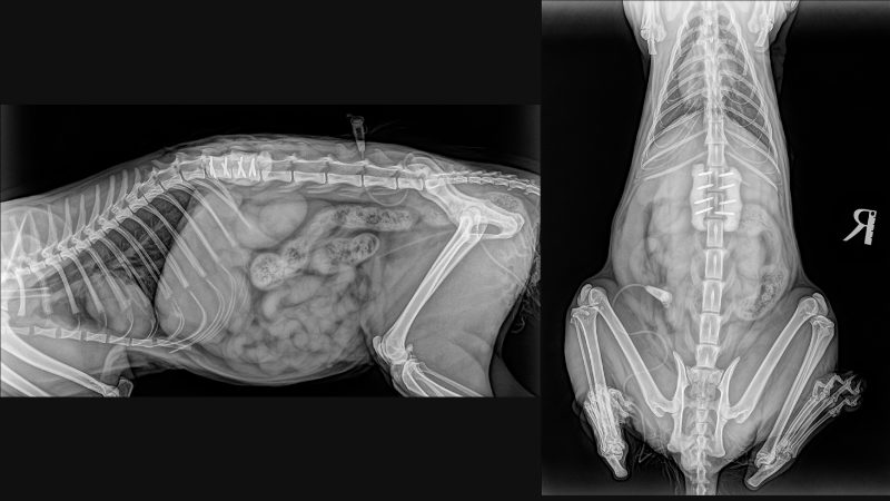 庭で飼われている猫ちゃんですが、4・5日見当たらず、発見時は家の裏でうずくまっていました。交通事故にあったと思われ、起立困難・自力排尿できませんでした。1週間後、全身状態を確認し、椎体脱臼整復手術を行いました。