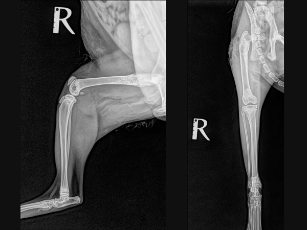 おそらく階段から落下し、右大腿骨を骨折しました。術前は右後足に体重をかけれない様子でしたが、術後は快適に歩行しています。