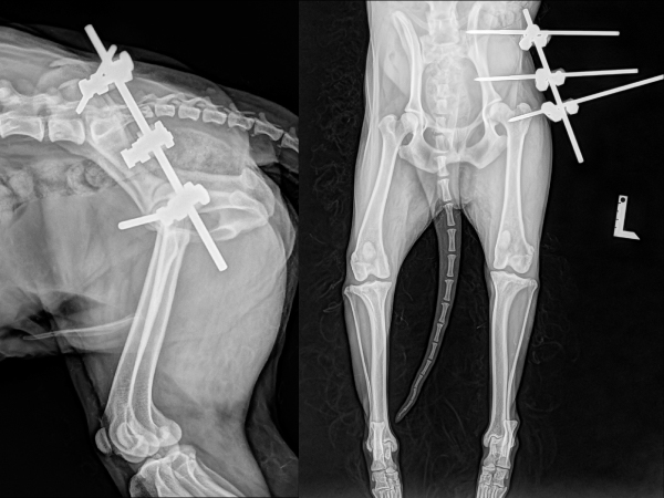 創外固定による固定を行いました。大腿骨が寛骨臼の定位置に整復されています。数週間固定を維持し、関節包の繊維化による安定化を図ります。
